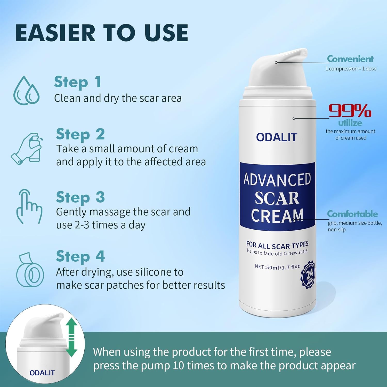 ODALIT Advanced Silicone Scar Cream uses revolutionary high-quality silicone bio-oil, penetrating deeply into scar tissue for immediate results. The silicone gel formula, combined with powerful repair ingredients, quickly moisturizes, softens, and smoothens scars, making them smaller, flatter, and more even, significantly improving skin texture in a short period and restoring your confidence!